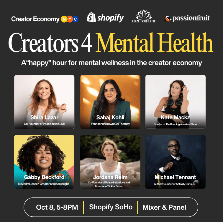 As a reminder, join us for the 'Creators 4 Mental Health Happy Hour' on Tuesday, October 8, from 5-8 PM in NYC! Learn tools for supporting your well-being in the creator economy. Plus, food, non-alcoholic drinks, and connect with amazing wellness brands too. Don’t miss out—register now to secure your spot!